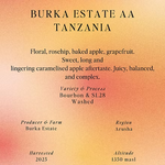 The Bourbon & SL28 lot is carefully washed and sun-dried at Burka’s wet mills, allowing full control over fermentation and drying. The result is a sweet, juicy, and complex Tanzania AA, with floral notes, baked apple, grapefruit, and a lingering caramelized finish — reflecting the same care and community spirit that defines life at Burka Estate.