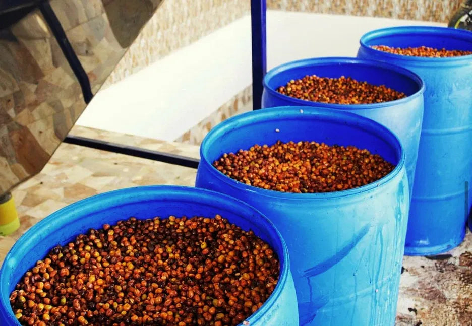 After the selection, the coffee is placed in plastic bins: the coffee beans are left to ferment intact, with the pulp, for 70 hours in the presence of carbon dioxide. This process enhances the sweetness and body of the final beverage, while intensifying the fruity notes in the cup. The changes during this initial stage are primarily enzymatic.