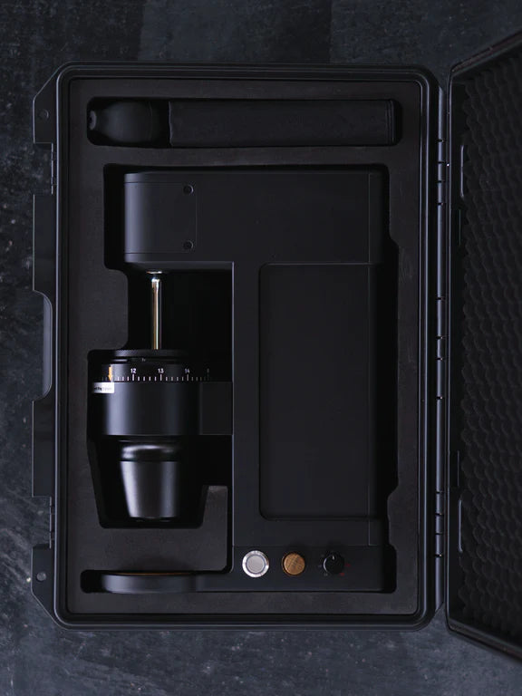 The Key Travel Case is a professional-grade solution for transporting the Weber Key grinder with maximum security and convenience. Its compact briefcase format allows it to be carried on with most airlines, while its rugged polypropylene shell and precision-cut foam provide enough protection for check-in travel. IP67 waterproof and dustproof, the case ensures full protection against the elements. A silicone handle enhances comfort, and lockable latches add peace of mind during transport.
